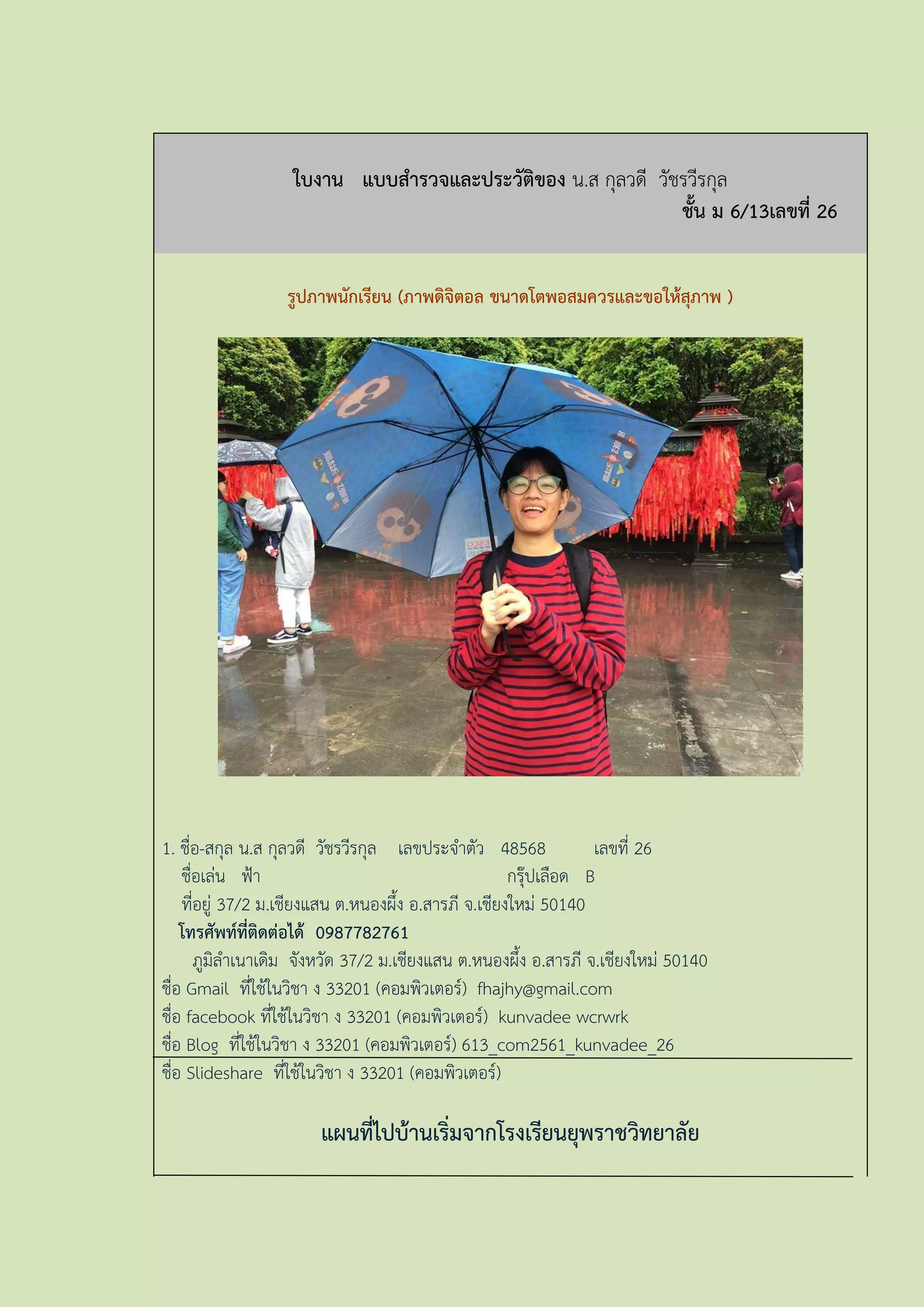 กุลวดี วัชรวีรกุล ชั้น ม 6/13เลขที่ 26 รูปภาพนักเรียน (ภาพดิจิตอล ขนาดโตพอสมควรและขอให้สุภาพ ) 1. ชื่อ-สกุล น.ส กุลวดี วัชรวีรกุล เลขประจำตัว 48568 เลขที่ 26 ชื่อเล่น ฟ้ำ กรุ๊ปเลือด B ที่อยู่ 37/2 ม.เชียงแสน ต.หนองผึ้ง อ.สำรภี จ.เชียงใหม่ 50140 โทรศัพท์ที่ติดต่อได้ 0987782761 ภูมิลำเนำเดิม จังหวัด 37/2 ม.เชียงแสน ต.หนองผึ้ง อ.สำรภี จ.เชียงใหม่ 50140 ชื่อ Gmail ที่ใช้ในวิชำ ง 33201 (คอมพิวเตอร์) fhajhy@gmail.com ชื่อ facebook ที่ใช้ในวิชำ ง 33201 (คอมพิวเตอร์) kunvadee wcrwrk ชื่อ Blog ที่ใช้ในวิชำ ง 33201 (คอมพิวเตอร์) 613_com2561_kunvadee_26 ชื่อ Slideshare ที่ใช้ในวิชำ ง 33201 (คอมพิวเตอร์) แผนที่ไปบ้านเริ่มจากโรงเรียนยุพราชวิทยาลัย