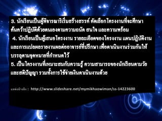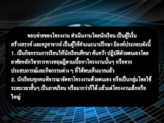 เดิมที่มีผู้รายงานไว้จุดมุ่งหมายสาคัญของการทาโครงงานเป็นการเปิดโอกาสให้นักเรียนได้รับ