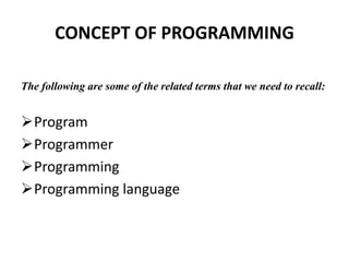- It defines key terms like programs, programmers, programming languages, and controls.