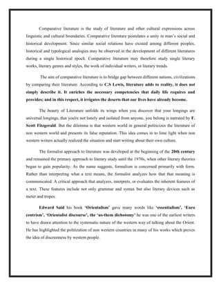 This document is a comparative literature assignment submitted by Fatima Gul that discusses the politicization of non-Western literature and rejection of the formalist approach. It provides examples of how Western civilization has presented an inaccurate portrayal of non-Western cultures and politicized their literature. It discusses several non-Western writers like Chinua Achebe and Frantz Fanon who highlighted the negative impacts of Western colonialism and how it disrupted traditional ways of life in Africa and presented the colonized people in a demeaning light. The assignment argues that the formalist approach to studying literature fails to acknowledge the deeper themes, ideas and philosophies in non-Western works and asserts the need to consider the socio-historical contexts.