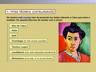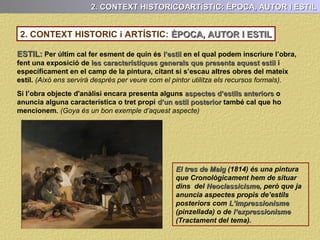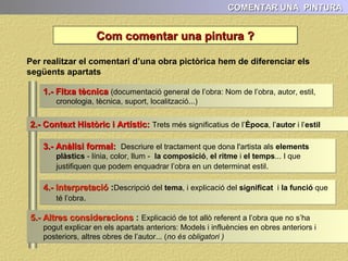 Explicació del procediment a seguir per comentar una obra pictòrica prenent com a base per exemplificar el procés les pintures seleccionades per l’examen de les PAU 2020. La presentació també inclou a les darreres diapositives un esquema resúm del guió a seguir per comentar una obra pictòrica, seguint els criteris establerts per l'exercici de les PAU 2020.