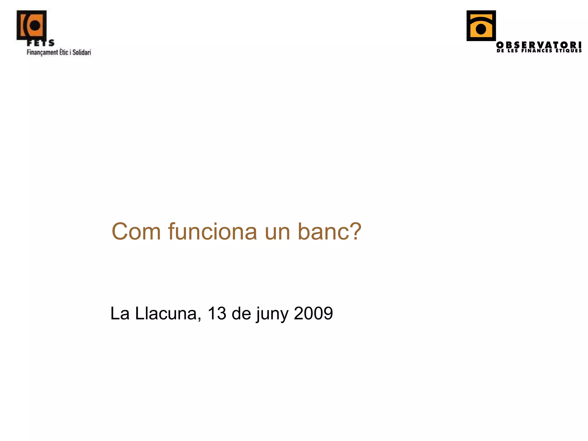 Alternatives: Financesètiques Coop57, FIARE, OikoCredit, Triodos,... www.fets.org (observatori: papers I baròmetre) Finances sense interessos Bank Jak (www.jak.se/int) Banca Islàmica Monedes locals i “trueque” (John Roger, Debora Nunes) Recolzar els moviments per la sostenibilitat I la Economia Social I Solidaria