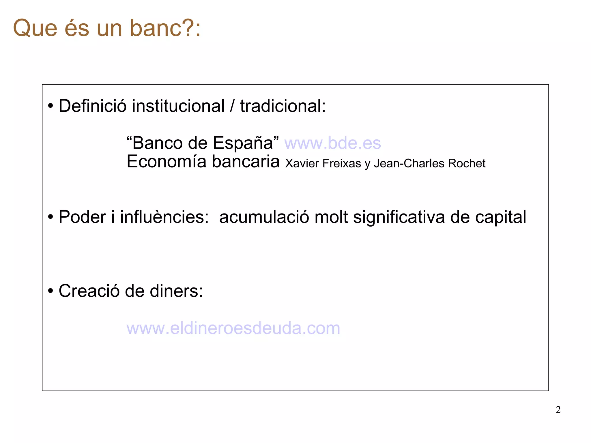 Que és unbanc?: Definició institucional / tradicional: “ Banco de España” www.bde.es Economía bancaria Xavier Freixas y Jean-Charles Rochet Poder i influències: acumulació molt significativa de capital Creació de diners: www.eldineroesdeuda.com