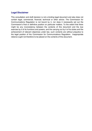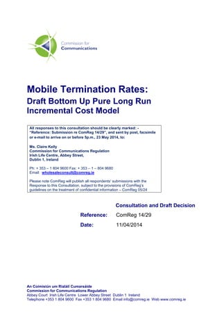 This document introduces ComReg's draft bottom-up pure long-run incremental cost (LRIC) model for setting mobile termination rates in Ireland. It provides background on mobile termination rates and ComReg's regulatory approach. ComReg engaged consultants to build a draft bottom-up pure LRIC cost model using input from mobile operators. This consultation seeks comments on the draft model's parameters and methodology before ComReg issues a decision later in the year. The High Court has postponed its ruling on pure LRIC pending completion of the model.