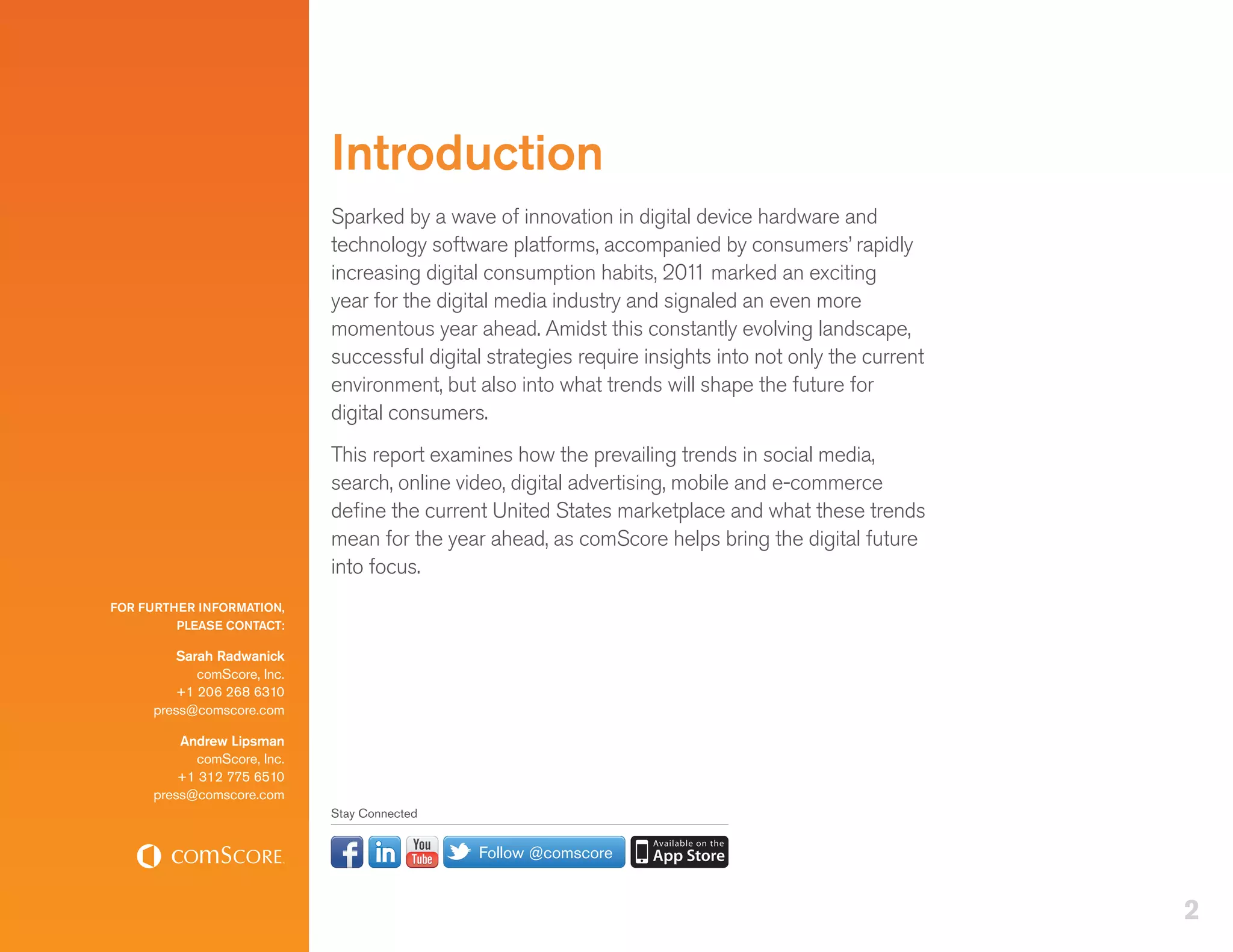 Social networking accounted for 16.6% of online time in 2011 and is on track to surpass portals in 2012. Facebook continues to dominate with nearly 3/4 of US internet users visiting monthly and accounting for 15% of online time. Other networks like LinkedIn, Twitter, and Google+ saw growth, while Myspace declined. Emerging sites like Tumblr and Pinterest also gained users in 2011. The increasing importance of social media was evidenced by its growing engagement levels and ability to influence areas like politics, fundraising and content consumption across devices.