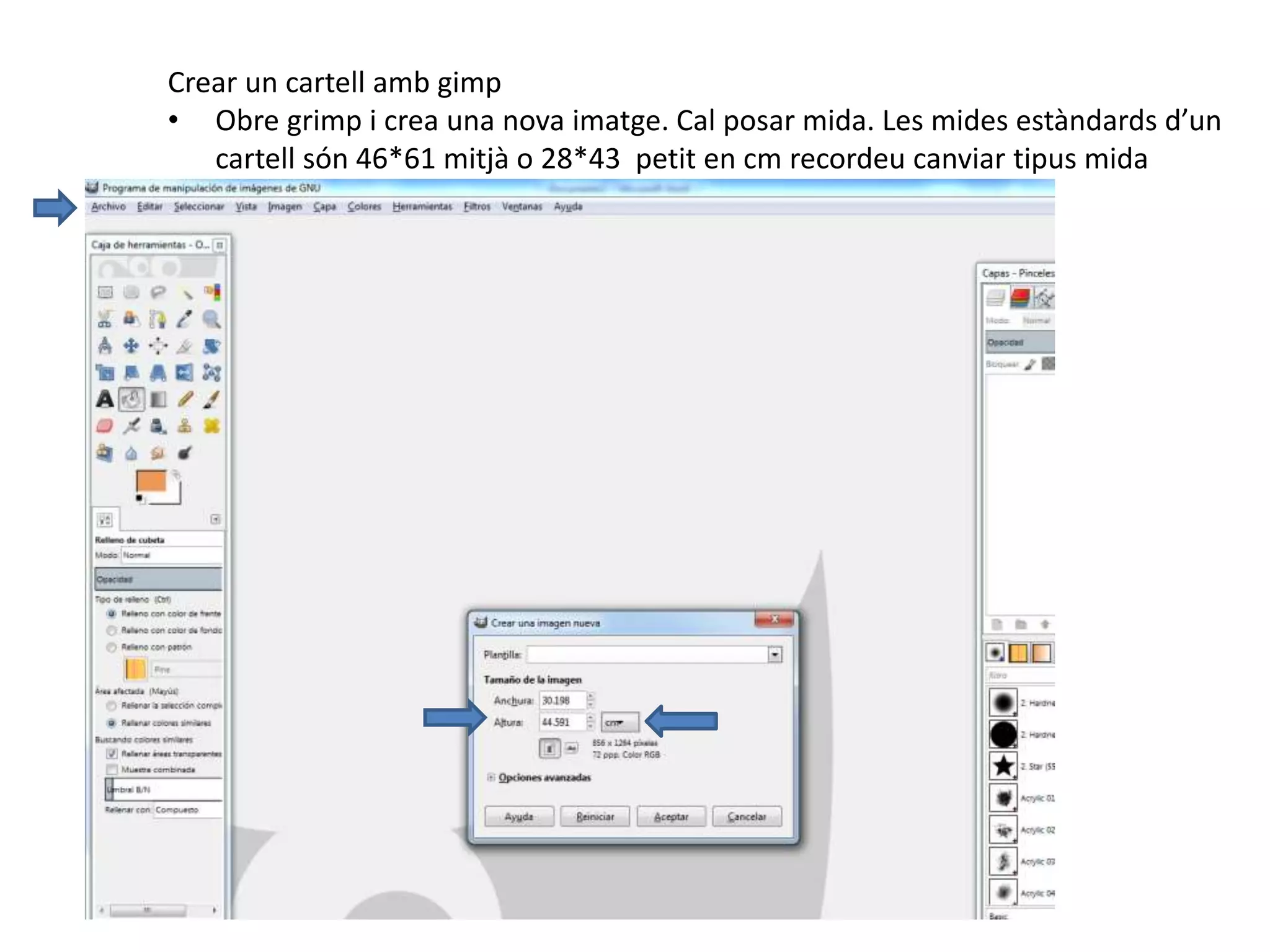 • Obre grimp i crea una nova imatge. Cal posar mida. Les mides estàndards d’un
