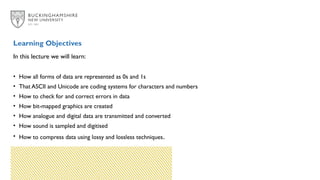 • Binary codescan be used to represent text, characters, numbers, graphics, video and audio.