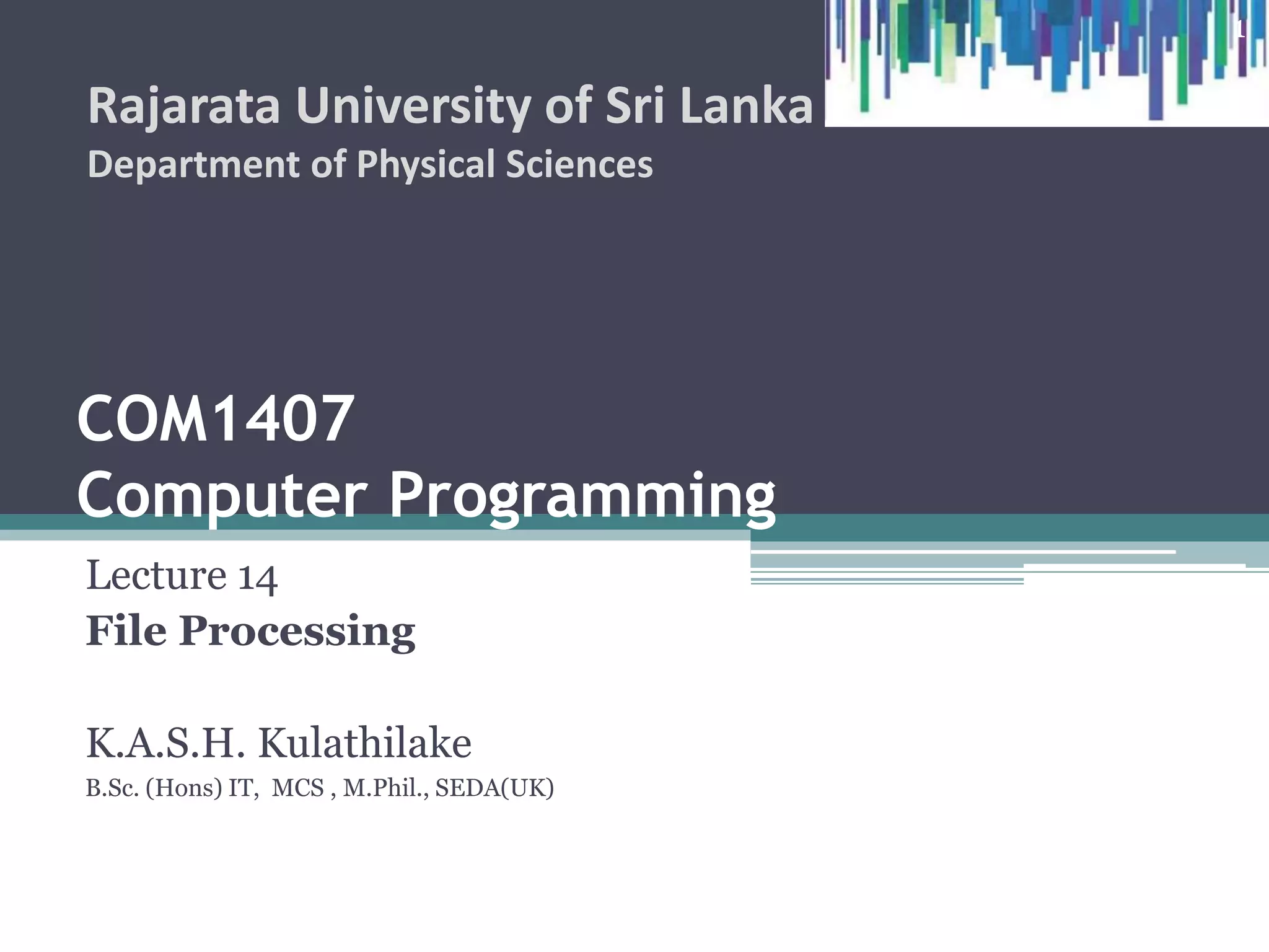 This document is a lecture on file processing in C programming, detailing concepts such as file management, streams, and I/O operations. It explains the use of standard library functions for opening, closing, reading, and writing to files, alongside the importance of file pointers and buffered I/O. Additionally, it provides examples and code snippets demonstrating various file operation techniques.