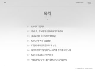 NAVER ๊น์งํ / / ยฉ 2014 NAVER Corp. All rights reserved. 01 NAVER๊ธฐ์ ๊ฐ์ 02 ๊ตญ๋ด IT/์ ๋ณดํต์ ์ฐ์ ๋ด์ฌ์ฑ์ง์ถํํฉ 03 ๊ตญ๋ด์ธ๊ธฐ์ ์ฌ์ฑ์์ํํฉ๋น๊ต 04 NAVER๋ด์ฌ์ฑ์ง์ถํํฉ 05 IT์ ๊ณ๋ด์ฌ์ฑ์์ ์ฌ๋ ฅ๋ฐ๋์ 06 ์ฌ์ฑ์๊ฒฝ๋ ฅ๋จ์ ๋ฐฉ์ง๋ฐ์ฌํ์ง์ถ์ฅ๋ ค๋ฅผ์ํ๋ ธ๋ ฅ 07 NAVER๋ณต๋ฆฌํ์/์ธ์ฌ์ ์ฑ 08 ์ฌ์ฑ๊ฒฝ๋ ฅ๋จ์ ๋ฐฉ์ง๋ฅผ์ํNAVER๊ณต์ต์บ ํ์ธ