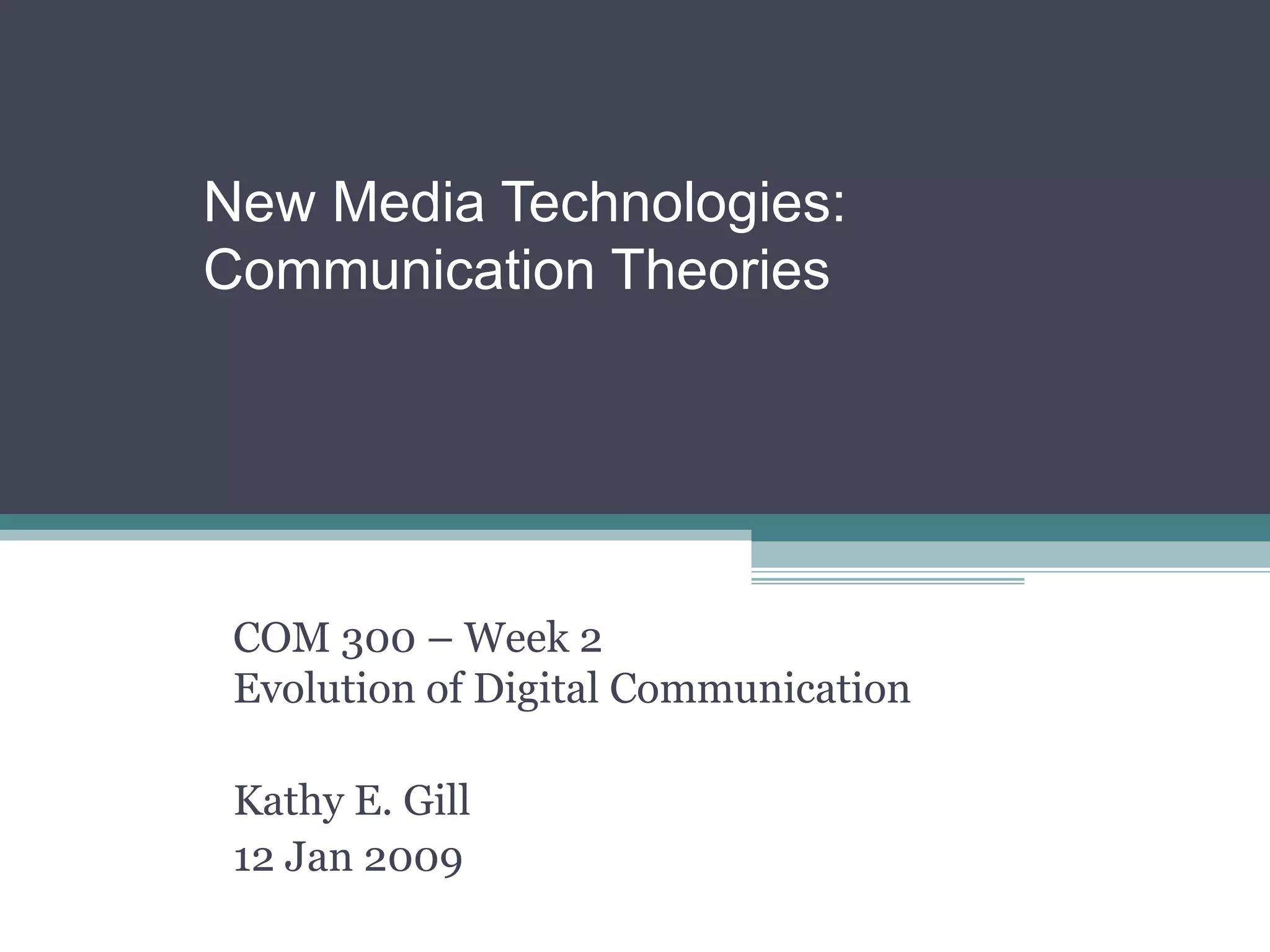 Mediated communication refers to communication that occurs through an intermediary or medium. New media technologies have removed constraints of scarcity, time, and space that previously defined mass communication. Key characteristics of new media include being dynamic, multi-media, nonlinear, and allowing users to control the pace and direction of communication.