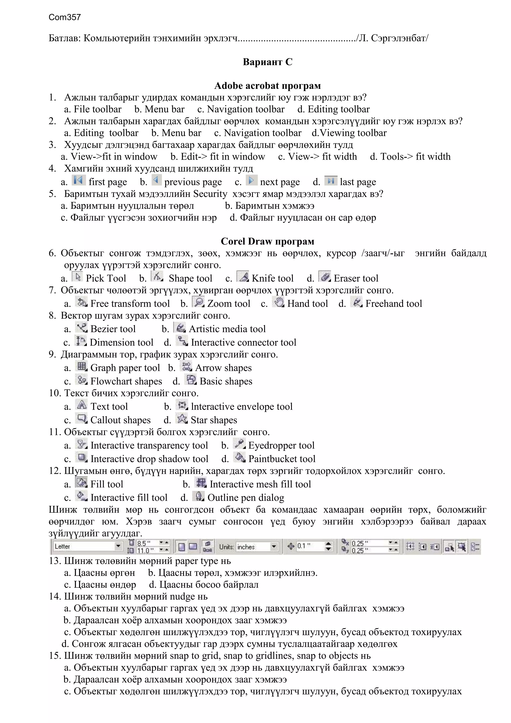 Документ содержит информацию о различных инструментах и функциях программного обеспечения, таких как Adobe Acrobat и Corel Draw. В нем перечислены команды для изменения отображения рабочей области, работы с объектами и текстом, а также настройки параметров графики. Спецификаций программы и их значений рассматриваются через выбор инструментов и команды.