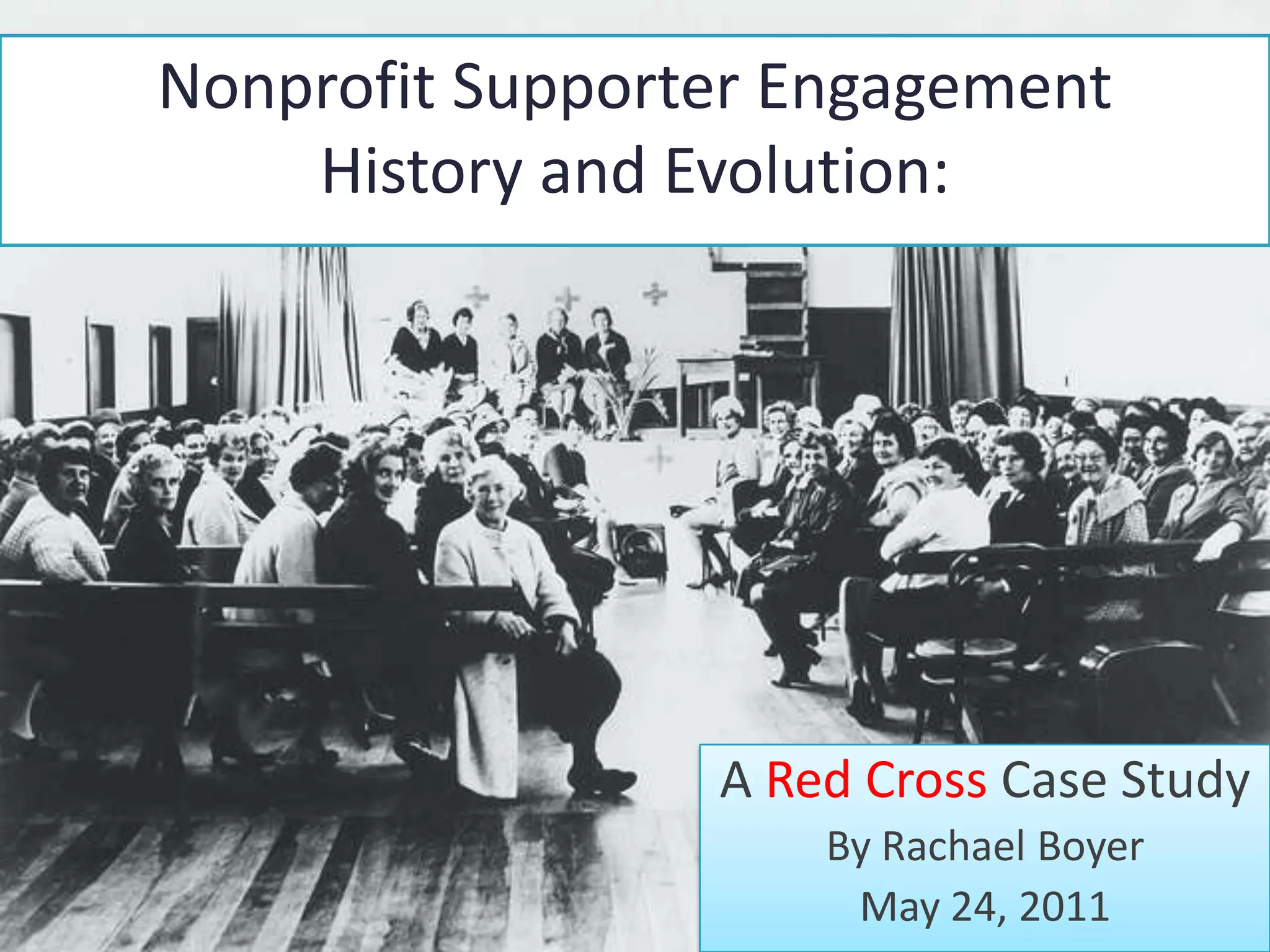 The document outlines the evolution of supporter engagement by the American Red Cross, beginning with Clara Barton's initial meetings and her ability to motivate volunteers. It discusses the transition from traditional communication methods such as newsletters to modern avenues like email campaigns, social media, and text giving, highlighting the importance of multi-way communication. The text speculates on future developments in nonprofit communications driven by advancements in mobile technology and smart devices.