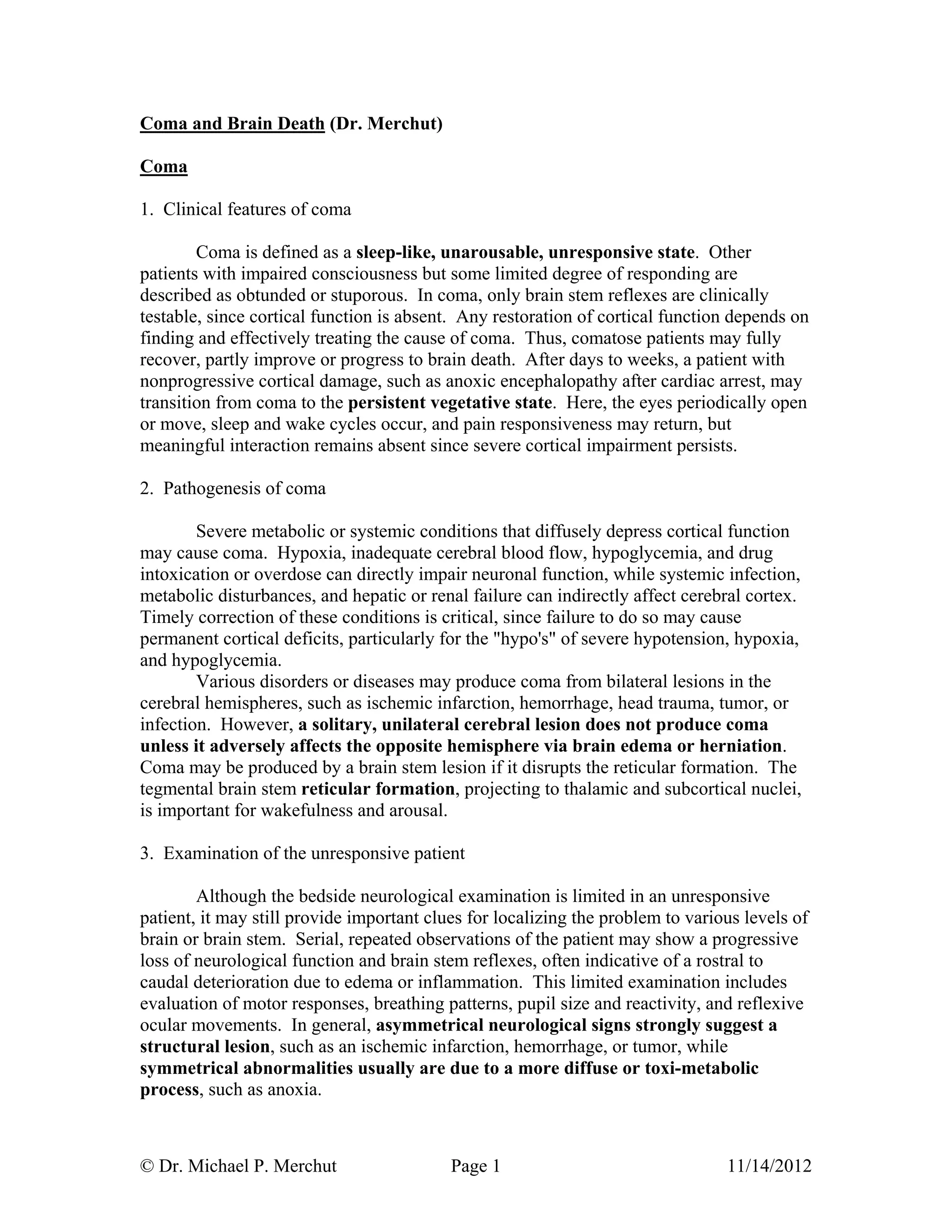 Coma and brain death are discussed. Coma is defined as an unresponsive state where only brainstem reflexes remain. Causes of coma include metabolic disturbances, structural lesions, and brainstem lesions. Examination of comatose patients involves assessing motor responses, breathing patterns, pupil size/reactivity, and reflexive eye movements. Brain death is the irreversible loss of brain and brainstem function, inevitably leading to organ failure. Diagnosing brain death requires determining the cause is sufficiently severe, no improvement after treating reversible causes, and absence of brainstem reflexes over an observation period.