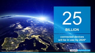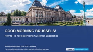 The document discusses how IoT is revolutionizing customer experience through beacon technology. It notes that over 25 billion connected devices will be in use by 2020. Beacons are small, battery-powered devices that use Bluetooth Low Energy to broadcast short data strings to nearby devices within a range of up to 100 meters. The document outlines how combining beacon technology with mobile apps and customer data allows for proximity marketing, personalized and real-time content, gamified loyalty programs, and strengthened shopping experiences through indoor navigation, analyzing shopper behavior, and optimizing facilities. It presents Comarch's CRM and marketing solutions for leveraging beacon and customer data to improve customer engagement, targeting, and experiences.