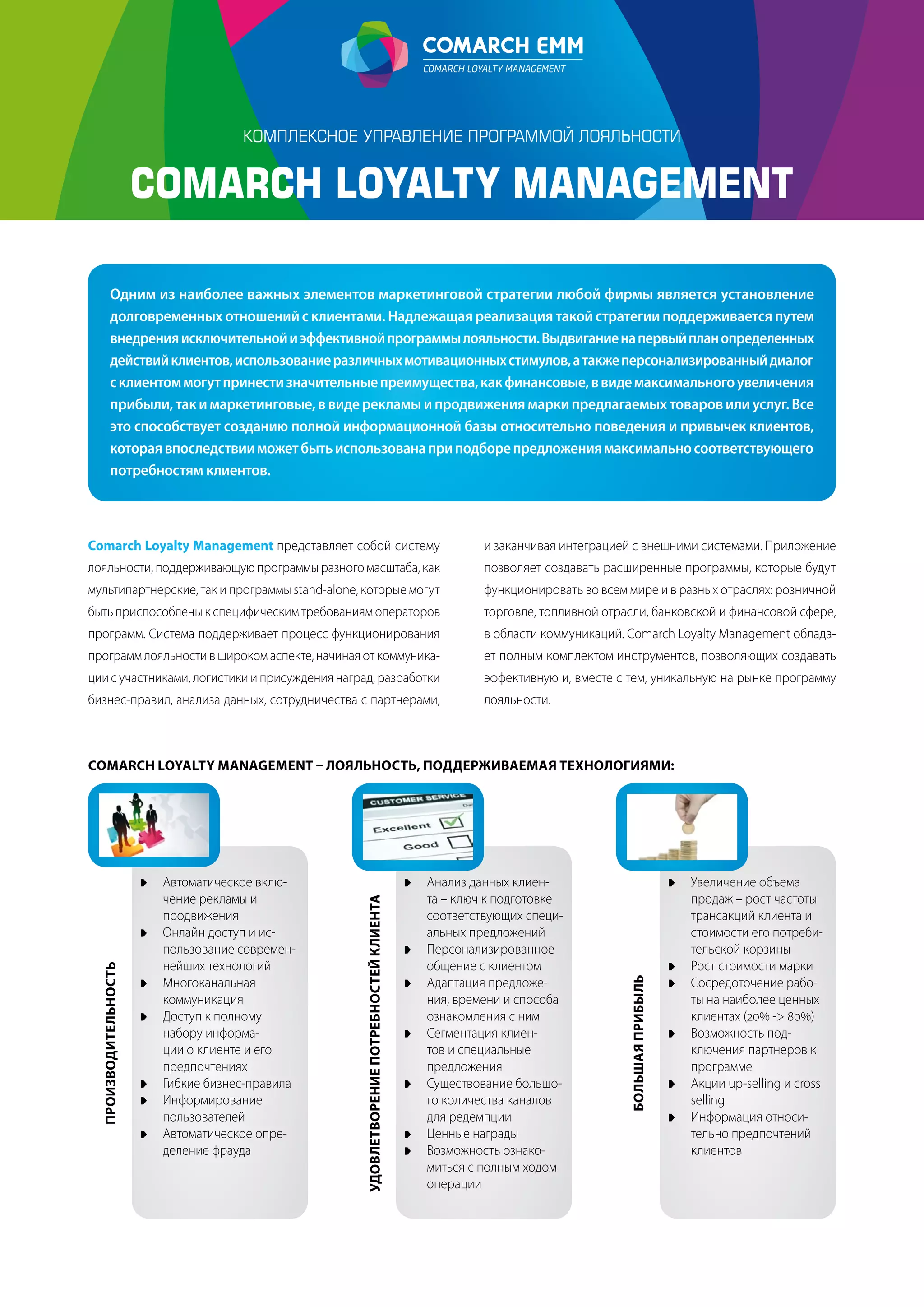 Документ описывает систему управления программами лояльности Comarch Loyalty Management, которая поддерживает компании в установлении долговременных отношений с клиентами через персонализированные программы лояльности. Система обеспечивает комплексное управление процессами лояльности, начиная от коммуникаций и аналитики до наглядного подбора предложений для клиентов. Кроме того, система адаптируется под различные отрасли и нужды бизнеса, предоставляя гибкие решения и интеграционные возможности.