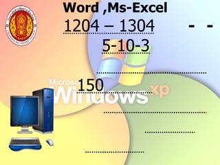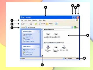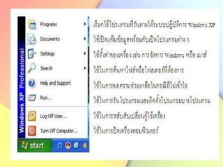 This document provides instructions on using basic features in Microsoft Windows XP. It discusses starting and shutting down Windows XP, using the desktop and icons, mouse functions like clicking and dragging, keyboard shortcuts, and basic commands like copying and pasting in programs. The document also includes diagrams of computer hardware components and screenshots of the Windows XP interface.