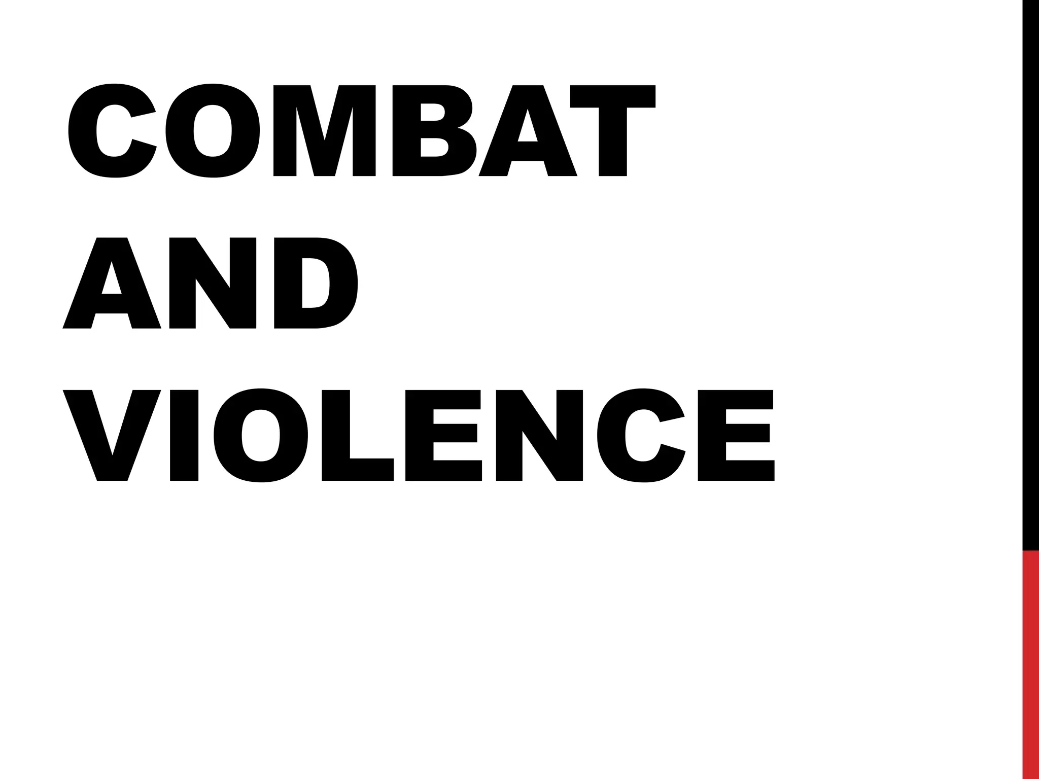 This document discusses types of combat and violence seen in films, providing examples for each type. It also examines narrative reasons for combat scenes in films, listing common motivations. Viewers are asked to provide additional examples and suggest other categories for types of combat. An Avengers Assemble fight scene is shared as an example for analysis.