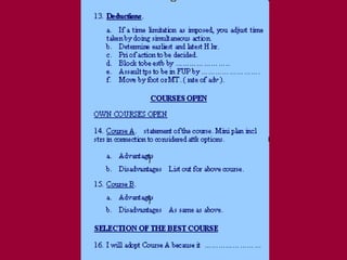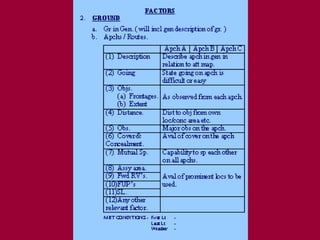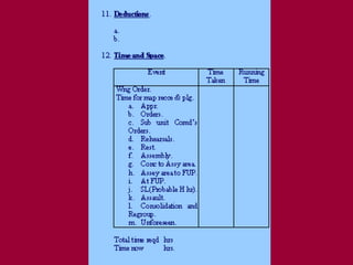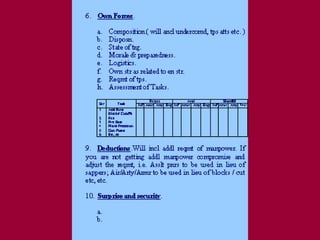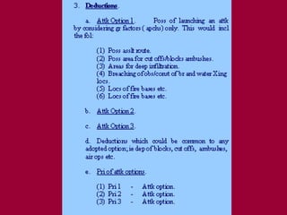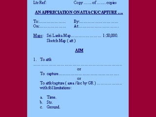 The document discusses the process of conducting a military appreciation or tactical decision making. It begins by defining an appreciation and outlines the key steps: formulating the aim, reviewing factors, making deductions, considering courses of action, and selecting the best course. It provides examples and details for each step. The document aims to acquaint readers with the military decision making process at the tactical level.