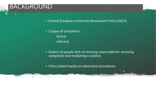 The document discusses a new harassment policy developed by the Central European University, which aims to improve the reporting and handling of harassment complaints. Key innovations include a network of trained ombudspersons to manage complaints and a centralized, anonymous complaint submission system. The policy addresses challenges such as underreporting, accountability, and compliance with GDPR while also preparing for implementation and training needs.