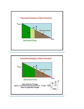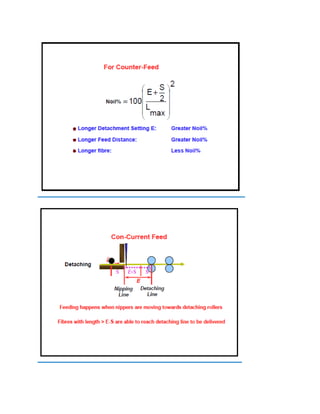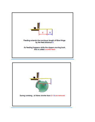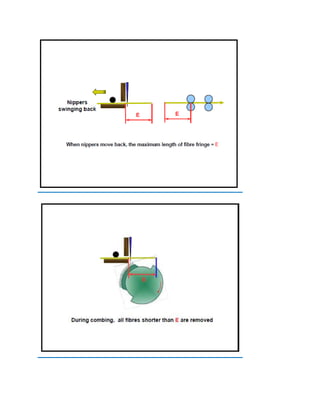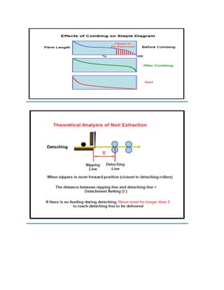 This document discusses the combing process used in spinning mills to improve cotton fiber characteristics. It describes how combing removes short fibers and impurities through the actions of different combing elements like the top comb and nippers. The goal is to extract unusable fibers as noil waste while minimizing good fiber losses. The document provides details on combing machine components, the combing cycle, production calculations, and factors that influence the noil percentage. Overall, it serves to explain how combing upgrades raw cotton material to produce smoother, stronger yarn with fewer imperfections.