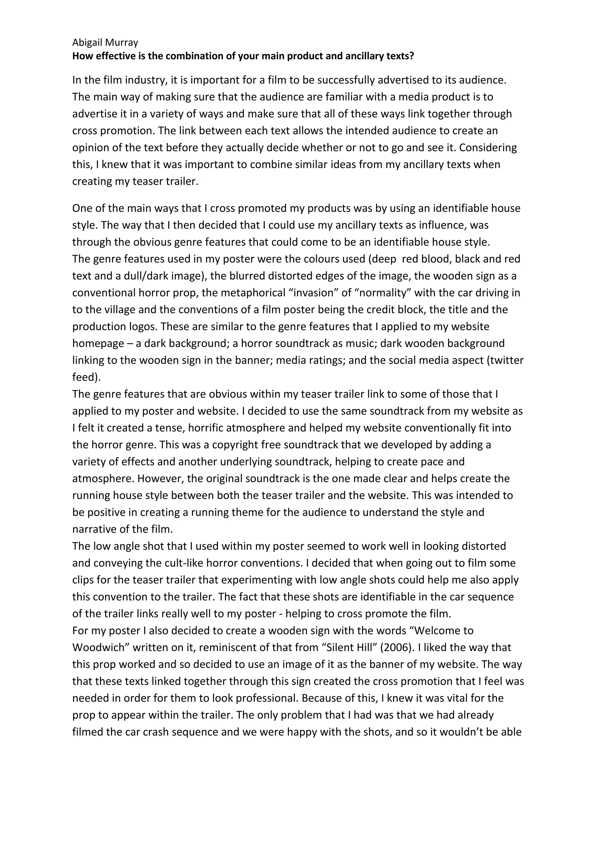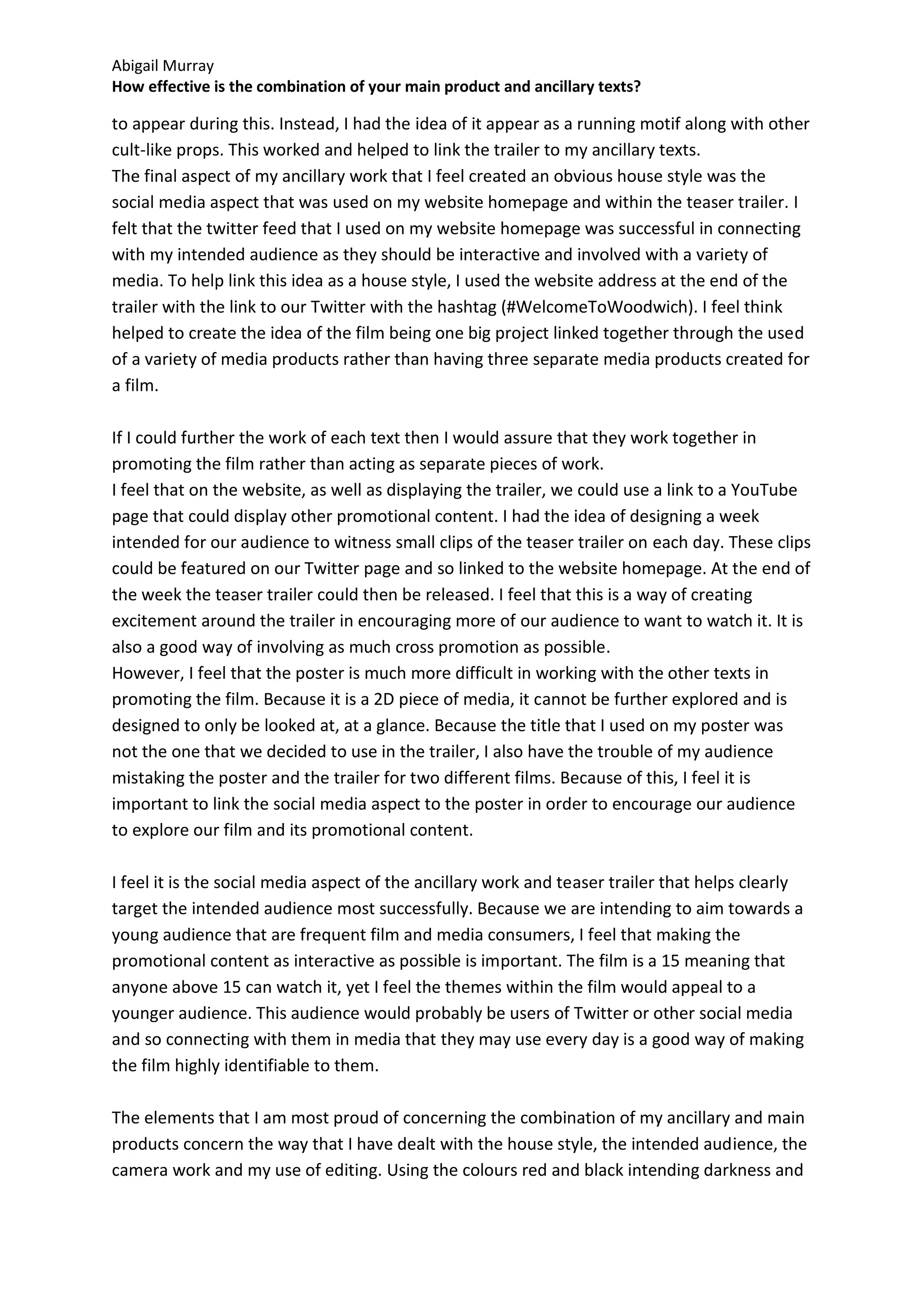 Abigail Murray created ancillary texts including a poster, website, and teaser trailer to promote her fictional film "Welcome to Woodwich." She aimed to develop a consistent "house style" across the texts by incorporating similar genre features and visual elements. For example, she used a dark color palette, horror soundtrack, and wooden sign prop in multiple texts. She also linked the texts by including social media elements on both the website and trailer. While each text promoted the film independently, Abigail felt the teaser trailer was most effective as it combined elements from the ancillary texts and showed her improved skills from the learning process.