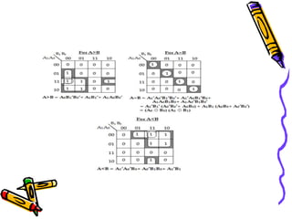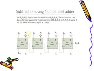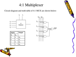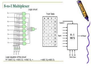 This document covers the fundamentals of digital electronics, specifically combinational circuit design, including components such as adders, subtractors, multiplexers, and comparators. It elaborates on the characteristics, applications, and design procedures for these circuits, highlighting their functional relationships and Boolean algebra. Key examples include the half adder, full adder, and various logic gates that operate without memory, relying solely on current input states.