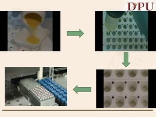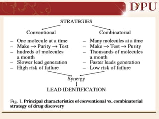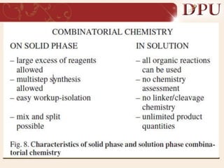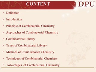 Combinatorial chemistry allows for the rapid synthesis of large libraries of compounds. It works by synthesizing many structures in parallel rather than one at a time. There are two main approaches: solid phase synthesis which attaches compounds to resin beads to isolate products, and solution phase which synthesizes in solvent. The libraries can be screened to identify active compounds more efficiently than traditional methods. This technique has increased the success of drug discovery by allowing testing of more structures at once.