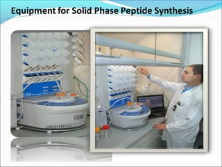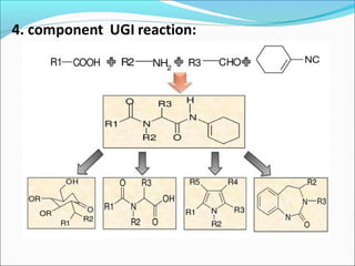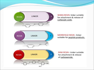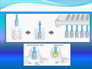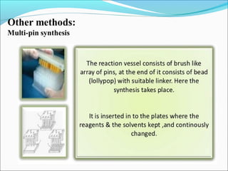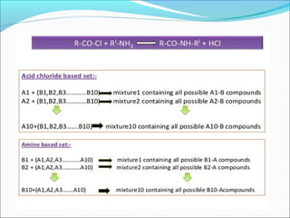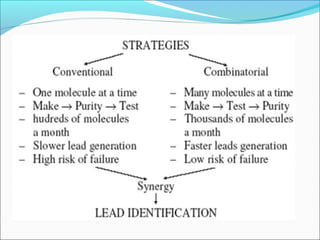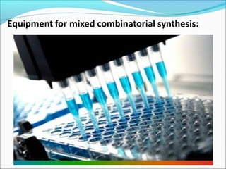This document discusses combinatorial chemistry techniques for rapidly producing large numbers of similar molecules for screening. It defines combinatorial chemistry as producing large numbers of analogs through the same reaction conditions. Solid phase synthesis on resin beads allows many reactions to occur in parallel. Methods like Houghton's "tea bag" approach and automated parallel synthesis in multi-well plates enable producing analog libraries. Mixed combinatorial synthesis combines reactants in mixtures that are then split and recombined to generate compound libraries without defining each structure. These techniques increase the efficiency and throughput of drug discovery.