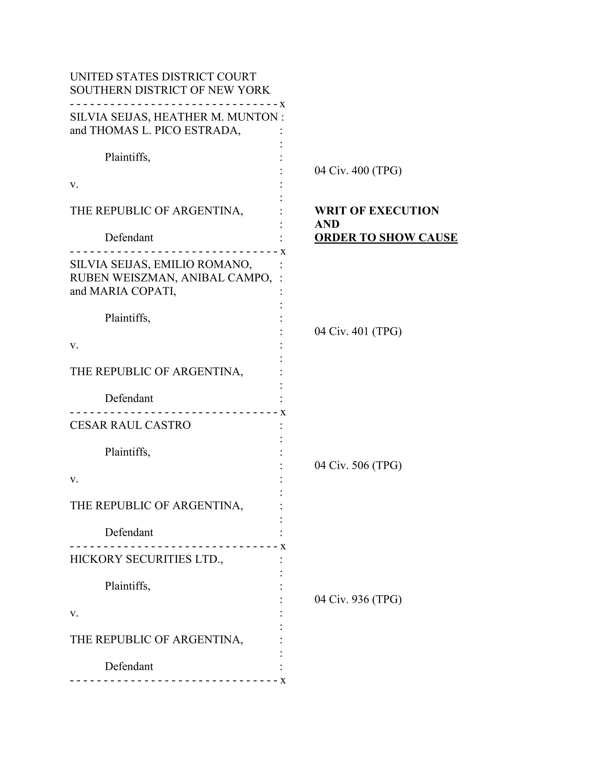 This document is an order from a United States District Court granting plaintiffs a writ of execution against defendant The Republic of Argentina. The court had previously entered judgments totaling over $2 billion against Argentina. The order authorizes the plaintiffs to execute against Argentine assets held in bank accounts in the United States, specifically assets held by or for Argentina in accounts maintained by Banco de la Nación Argentina branches in the US. It finds these funds are used for commercial activity so they can be executed upon to satisfy the previous judgments. The writ of execution allows the plaintiffs to issue restraining notices on the BNA branches pursuant to federal and New York state law.