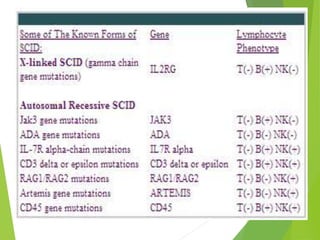 Combined immunodeficiencies are disorders affecting multiple components of the immune system, leading to severe immune deficiencies. Severe combined immunodeficiency (SCID) is characterized by mutations that impede the functionality of T and B lymphocytes, resulting in increased vulnerability to infections, particularly in infants. Various types of SCID exist, including X-linked and autosomal recessive forms, and while genetic factors play a significant role in inheritance, treatments such as bone marrow transplants and gene therapy are under investigation.