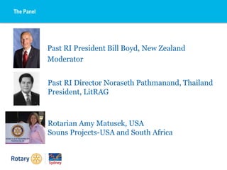 3) Examples are given of successful literacy projects conducted by Rotary clubs in countries like South Africa, Egypt, Liberia, and Puerto Rico. Projects focused on building basic literacy skills in preschools and