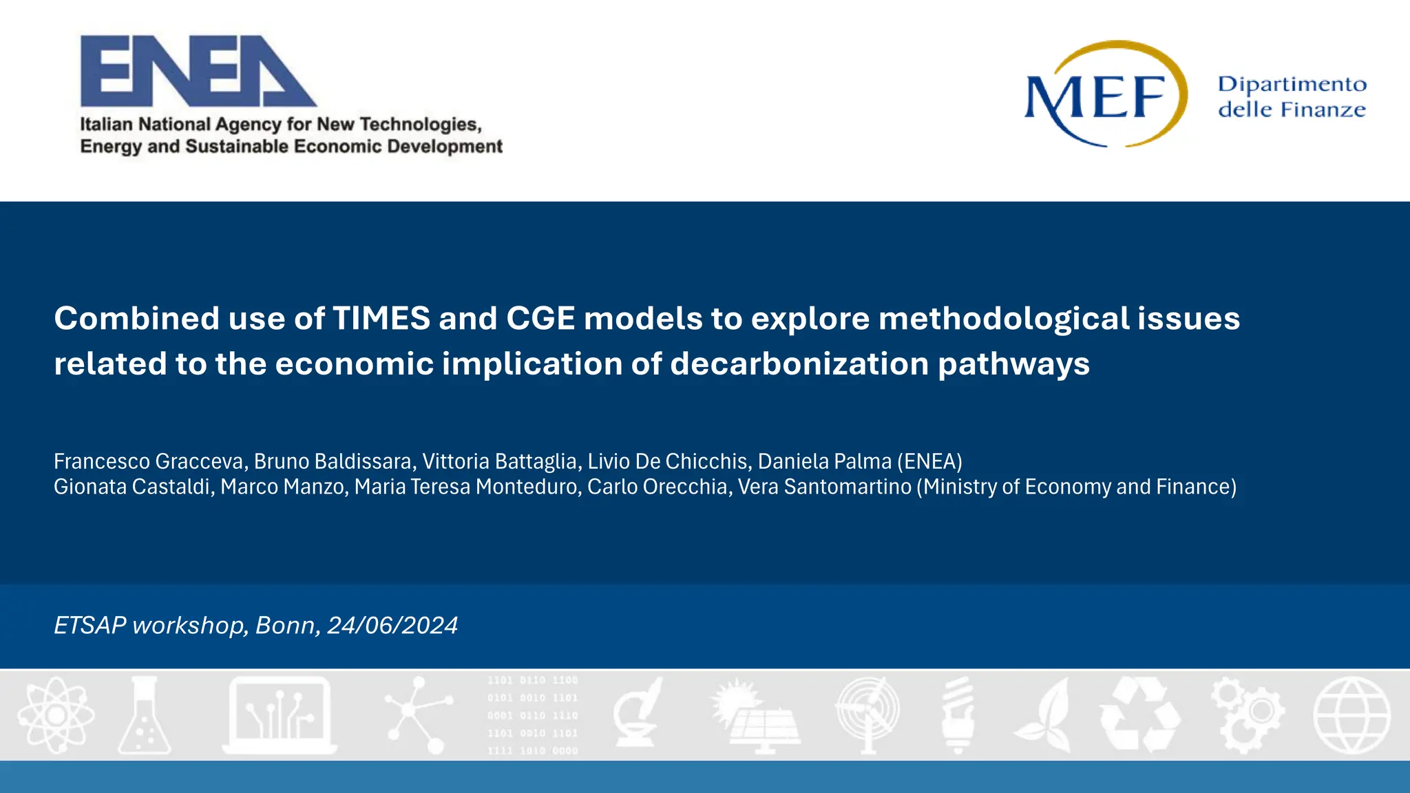 The document discusses the collaboration between ENEA and the Ministry of Economy and Finance (MEF) in Italy to contribute to the OECD's Inclusive Forum on Carbon Mitigation Approaches (IFCMA). It focuses on integrating top-down (CGE) and bottom-up (TIMES) models to enhance the understanding of carbon mitigation policies and their impact on greenhouse gas emissions through a refined methodology. Key phases involve pilot studies, data harmonization, and scenario analyses to model decarbonization pathways towards achieving net-zero emissions by 2050.