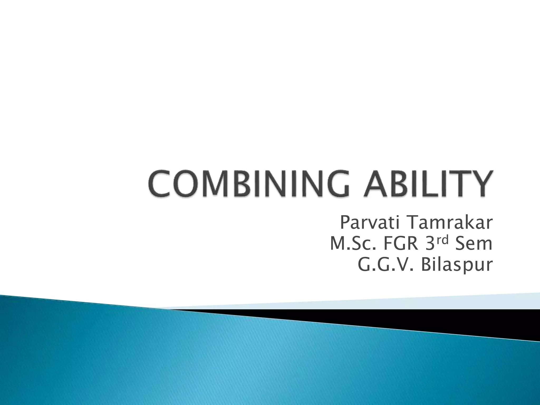 This document discusses combining ability, which refers to an individual's ability to transmit superior performance to its offspring. There are two types of combining ability: general combining ability (GCA) and specific combining ability (SCA). GCA is due to additive genetic effects and relates to an individual's average performance across hybrid combinations. SCA is due to non-additive genetic effects like dominance and epistasis and relates to performance in specific hybrid combinations. The concepts of GCA and SCA were introduced in corn breeding and have been applied to animal breeding as well. Progeny testing is used to examine combining ability.