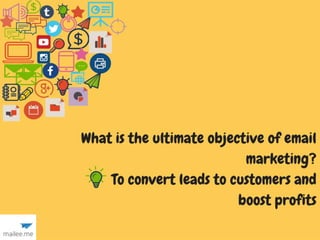 This document discusses ways to integrate social media and email marketing. It outlines six methods: including social media buttons in emails, uploading subscriber lists to social media, creating exclusive social media groups for subscribers, incentivizing email subscriptions on social media, holding contests requiring email entry, and setting email notifications for social media channels. The document emphasizes personalizing strategies based on each social media platform's strengths, such as using Facebook for B2C and LinkedIn/Twitter for B2B. It encourages readers to get started integrating social media and email marketing.
