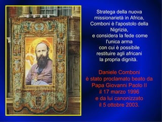 Daniele Comboni, nato a Limone sul Garda nel 1831 e morto a Khartoum nel 1881, è un importante missionario che ha dedicato la sua vita alla causa dei popoli africani, contribuendo a un risveglio apostolico. Canonizzato nel 2003, ha enfatizzato la fede come mezzo per restituire dignità agli africani, esprimendo le sue idee attraverso preghiere e scritti. Il documento celebra il suo operato e invita a seguire il suo esempio di dedizione e amore per Dio e per gli altri.