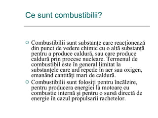 Combustibilii sunt substanțe chimice utilizate pentru producerea de căldură și energie, clasificați în combustibili fosili și regenerabili. Poluarea mediului, cauzată de utilizarea combustibililor, are efecte grave asupra sănătății umane și ecosistemelor, fiind asociată cu emisiile de gaze cu efect de seră și poluanți toxici. Energia alternativă, cum ar fi hidrogenul și sursele regenerabile, ușurează dependența de combustibilii fosili și contribuie la reducerea impactului ecologic.