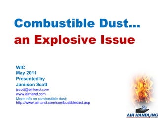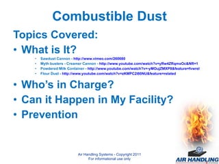 The document discusses the serious hazards associated with combustible dust in various industries, highlighting incidents such as the 2008 Georgia sugar refinery explosion that killed 13 people. It emphasizes the importance of regulation by organizations such as OSHA and the NFPA to prevent explosions through proper risk assessment, engineering controls, and housekeeping practices. The document also outlines recommendations for compliance and safety measures to protect workers and facilities from the dangers of combustible dust.