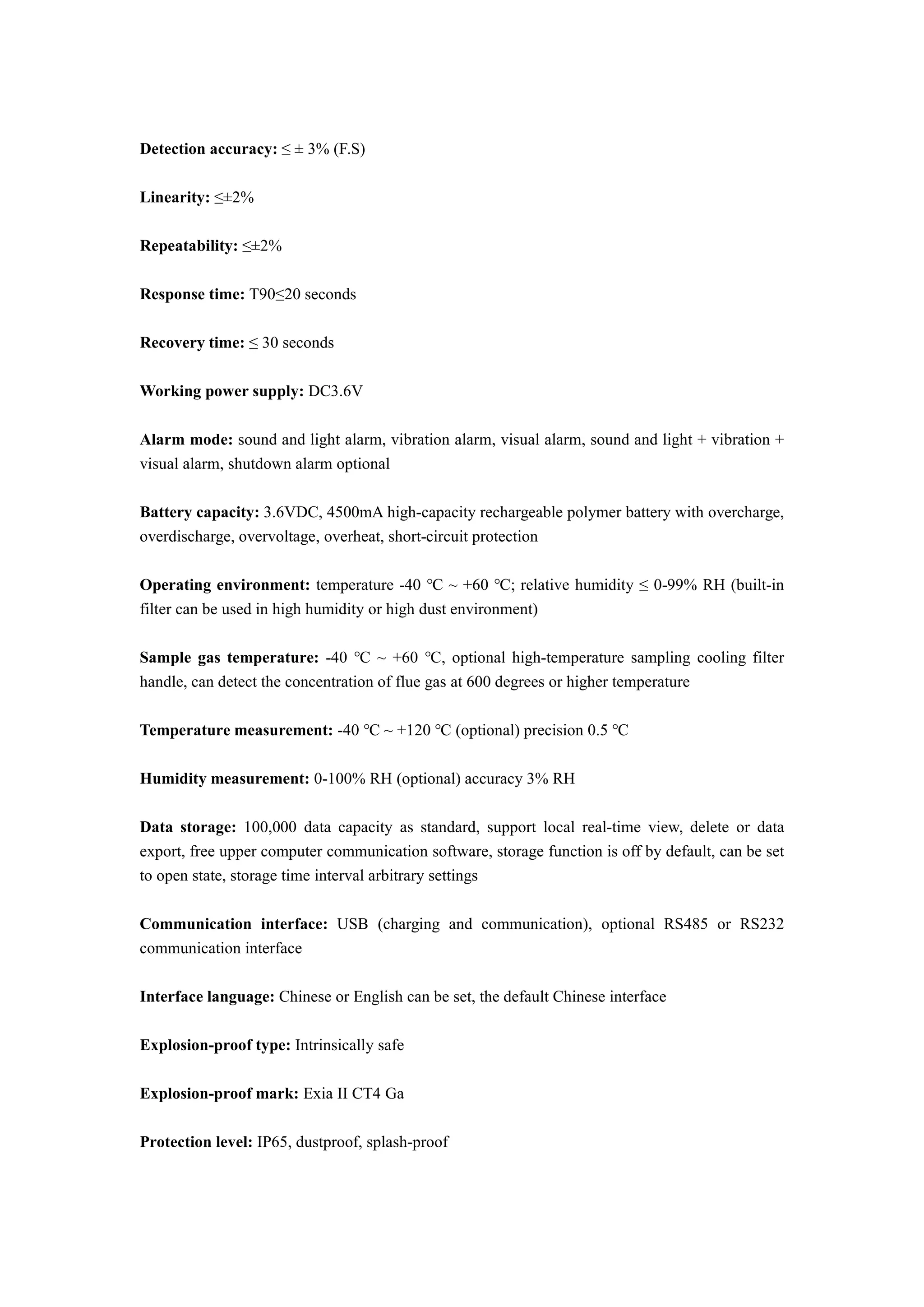 The combustible gas detector can detect gases like EX in a range of 0-100% LEL with a discrimination rate of 0.01% LEL using catalytic combustion. It has a 2-3 year sensor life, 500ml/min pump suction detection method, 2.4-inch color screen, IP65 rating, and dimensions of 160x70x28mm. It provides sound, light, and vibration alarms and has a 4500mAh polymer battery with overcharge, overdischarge, and temperature protections.