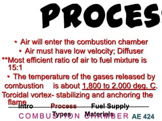 Air enters the combustion chamber through a diffuser to reduce velocity and mix with fuel in a 15:1 ratio for optimal combustion. A toroidal vortex anchors the flame in the chamber while combustion occurs at temperatures between 1,800 to 2,000 degrees Celsius, ignited by an electric spark and sustained by the flame.