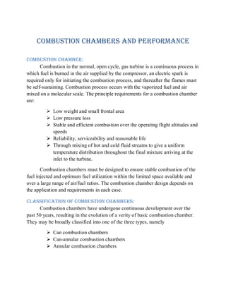 The document discusses combustion chamber design and types for gas turbine engines. It describes the key requirements for combustion chambers including low weight, stable and efficient combustion over operating conditions, and uniform temperature distribution. It classifies combustion chambers as can, can-annular, or annular and describes the characteristics and advantages/disadvantages of each type. Important factors for combustion chamber design are maintaining suitable turbine inlet temperatures, stable combustion over a range of operating conditions, and controlling emissions.