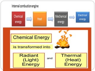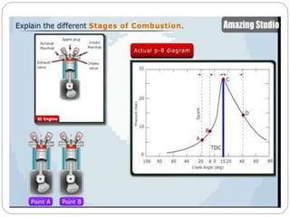 The document discusses combustion in spark-ignition (SI) engines. It defines combustion as a chemical reaction in which fuel combines with oxygen, liberating heat energy. In an SI engine, fuel and air are mixed and inducted into the cylinder where combustion is initiated by a spark at the spark plug near the end of the compression stroke. There are three stages of combustion: ignition lag, flame propagation, and after burning. Abnormal combustion phenomena like pre-ignition and knocking can occur if conditions are not suitable. Factors like turbulence, fuel-air ratio, temperature and pressure, compression ratio, and engine variables affect the flame speed and combustion process.