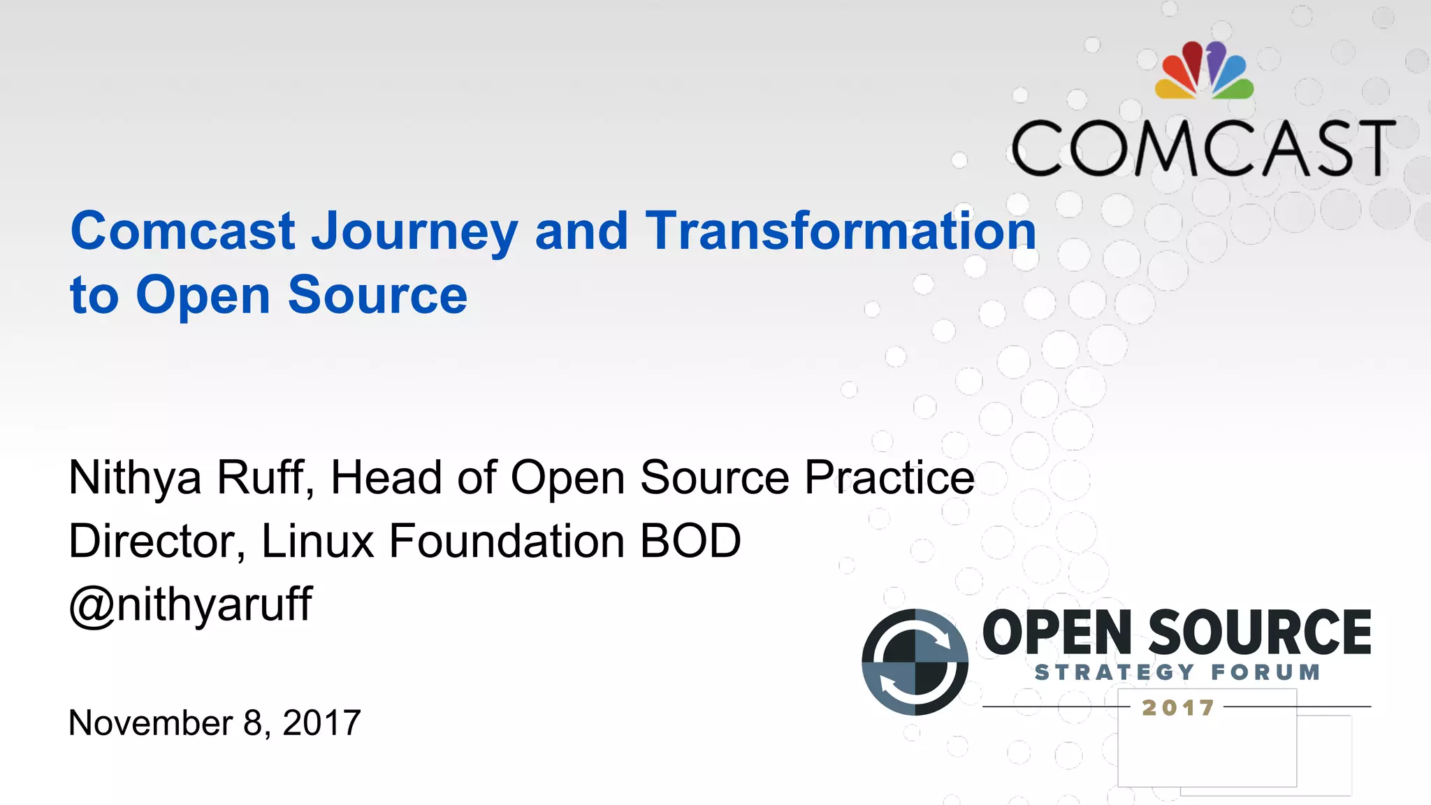 Comcast's open source transformation, led by Nithya Ruff, highlights the shift from consuming to creating and contributing within the open source community, emphasizing the necessity of open source in modern technology. Since 2000, Comcast has evolved into a software organization, launching innovations like the X1 entertainment system and advanced broadband services. The company's open source practice, established in 2017, focuses on compliance, community engagement, and cultural transformation to enhance customer experience and drive innovation.