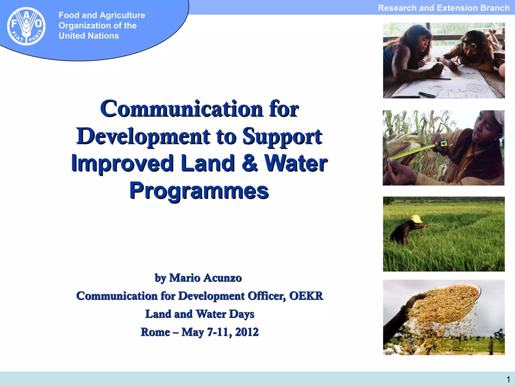 This document discusses communication for development (ComDev) to support improved land and water management programs. It defines different types of communication, including corporate communication, internal communication, advocacy communication, and communication for development. Communication for development uses participatory methods to support sustainable change by engaging stakeholders. The document provides examples of ComDev projects in Mexico, Bangladesh, and Bolivia that used participatory communication approaches. It discusses key ComDev elements like fostering dialogue and convergence of local and scientific knowledge. Finally, it introduces the Communication for Sustainable Development Initiative, which aims to improve capacities and partnerships for natural resource management through communication.