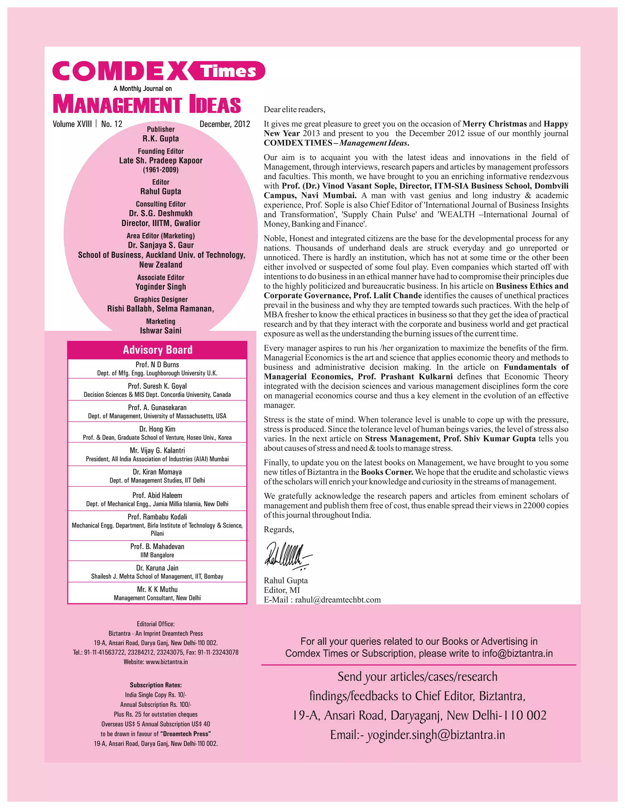 The December 2012 issue of Comdex Times focuses on various management ideas, highlighting interviews, articles, and research in management. Key discussions include ethical practices in business, managerial economics, stress management, and advancements in education such as cloud computing and digital media's impact on marketing. The issue features insights from Prof. Vinod V. Sople and emphasizes the importance of ethics and contemporary challenges in management education.