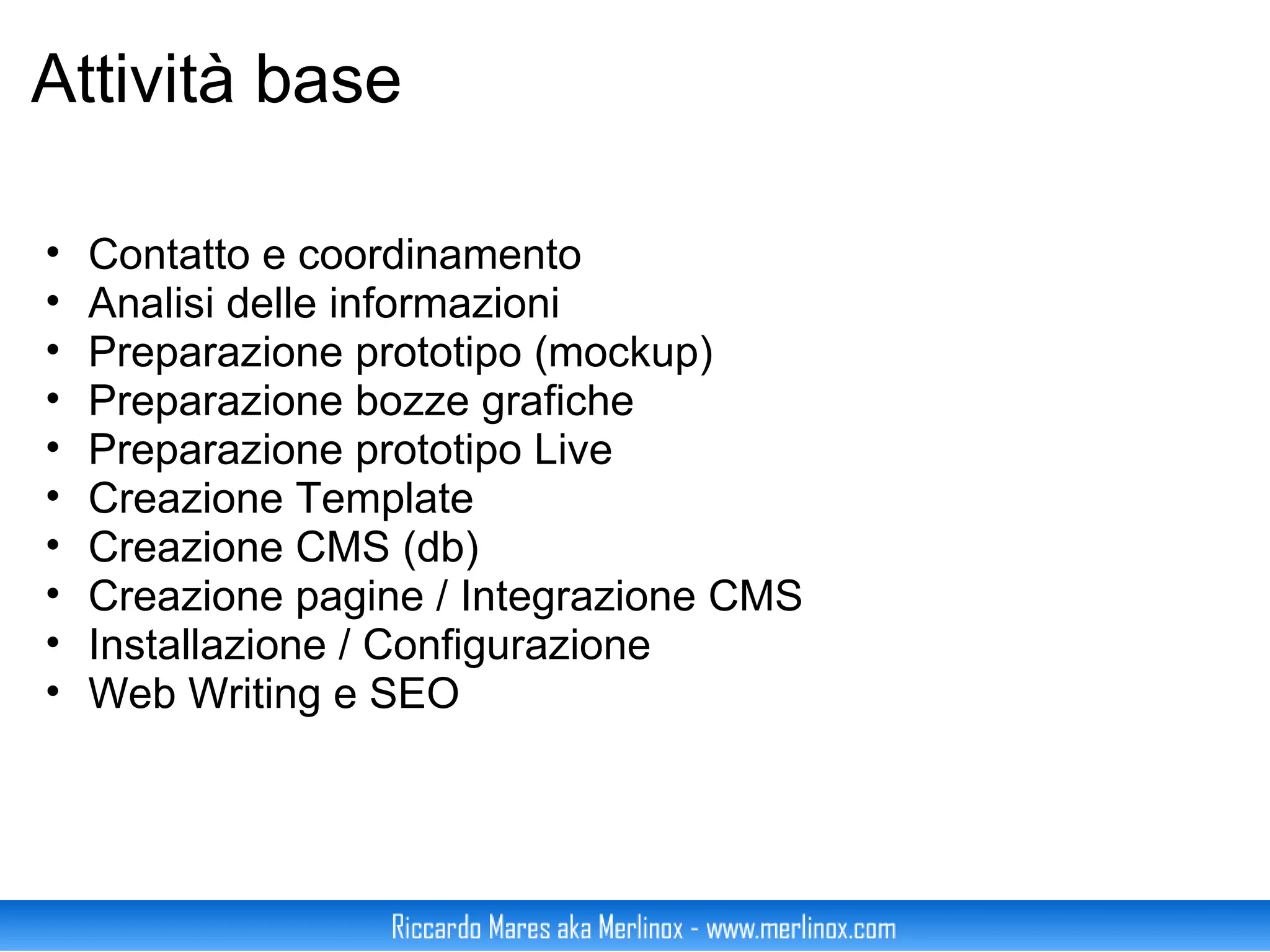 Il documento descrive le fasi fondamentali nella realizzazione di un progetto web, inclusi contatto con il cliente, analisi delle informazioni, creazione di prototipi e template, sviluppo di un CMS, e SEO. Viene enfatizzata l'importanza di un'attenta gestione delle tempistiche e della comunicazione durante tutto il processo. Si menzionano anche le attività di scrittura web e promozione come parte integrante di un progetto web completo.