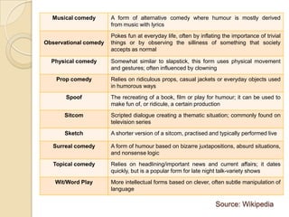 The document discusses various genres of comedic styles, detailing their unique characteristics and themes, such as alternative comedy, black and blue comedy, character comedy, and improvisational comedy. It also mentions specific forms including cringe comedy, mockumentary, and topical comedy, emphasizing different approaches to humor, from physical movement to satirical commentary on everyday life. Overall, it provides an overview of how these styles diverge from traditional punchline humor to explore a broader range of comedic expression.