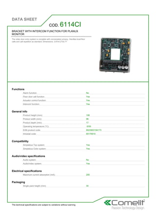The document outlines the technical specifications for a video door entry system that features an intercom function, local floor calls, and call repetition. It includes dimensions, product details, compatibility information with different systems, and electrical specifications. The product operates within a temperature range of -5/55°C and has specific packaging dimensions and weight.