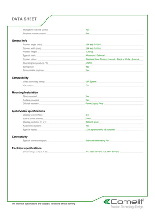 The document provides technical specifications for a VIP audio/video kit that includes various modules and components, ready for use except for the slave gateway configuration. Key features include a customizable ringtone, multiple control functions, and compatibility with the VIP video door entry system. The kit can be expanded with other products from the VIP catalog and is designed for both flush-mounted and surface-mounted installations.
