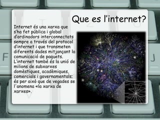 Que es l’internet?Internet és una xarxa que s’ha fet pública i global d’ordinadors interconnectats sempre a través del protocol d’internet i que transmeten diferents dades mitjançant la comunicació de paquets. L’internet també és la unió de milions de subxarxes domèstiques, acadèmiques, comercials i governamentals; és per això que de vegades se l'anomena «la xarxa de xarxes».