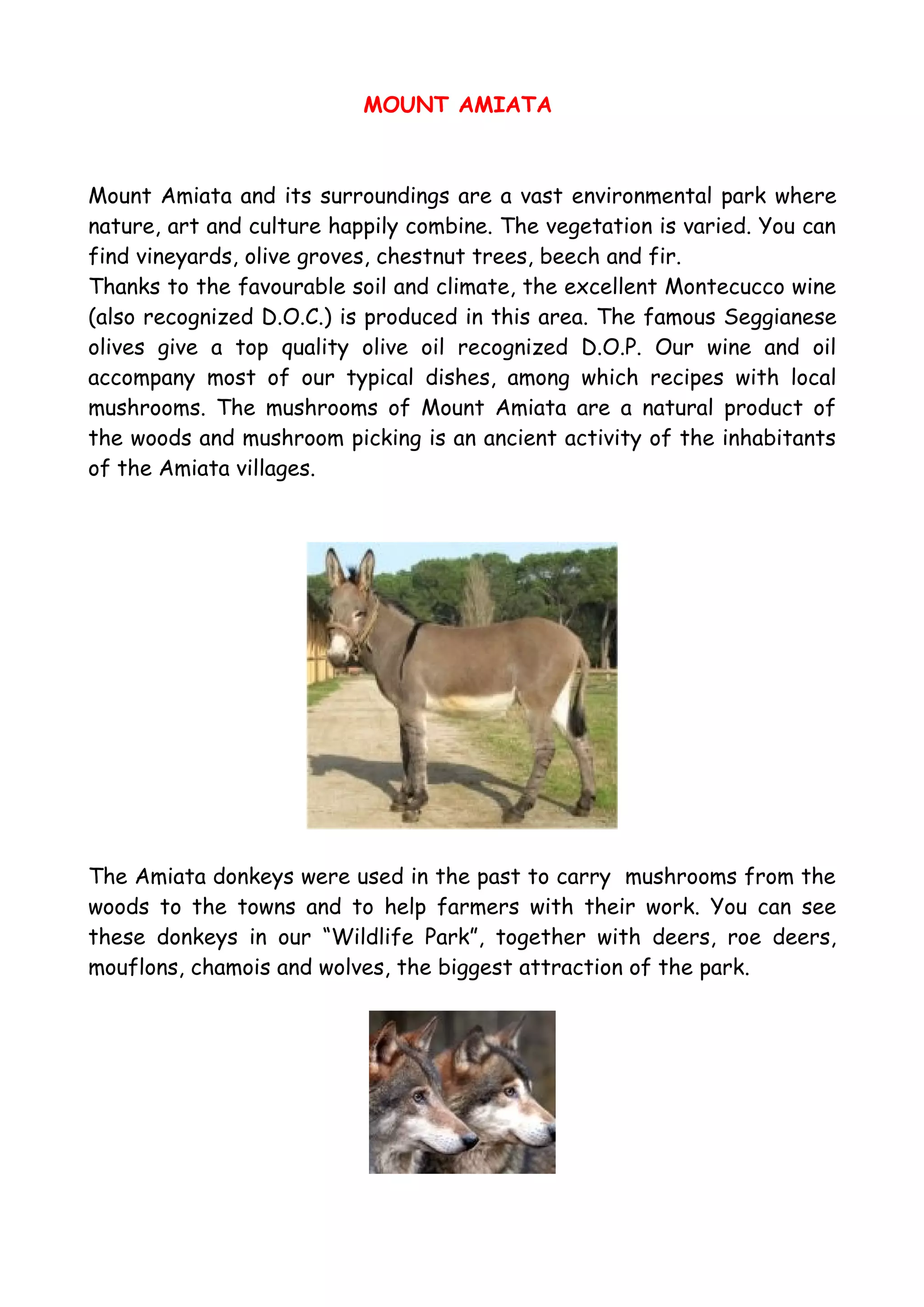 The document provides information on Mount Amiata and the surrounding area in Italy, including: